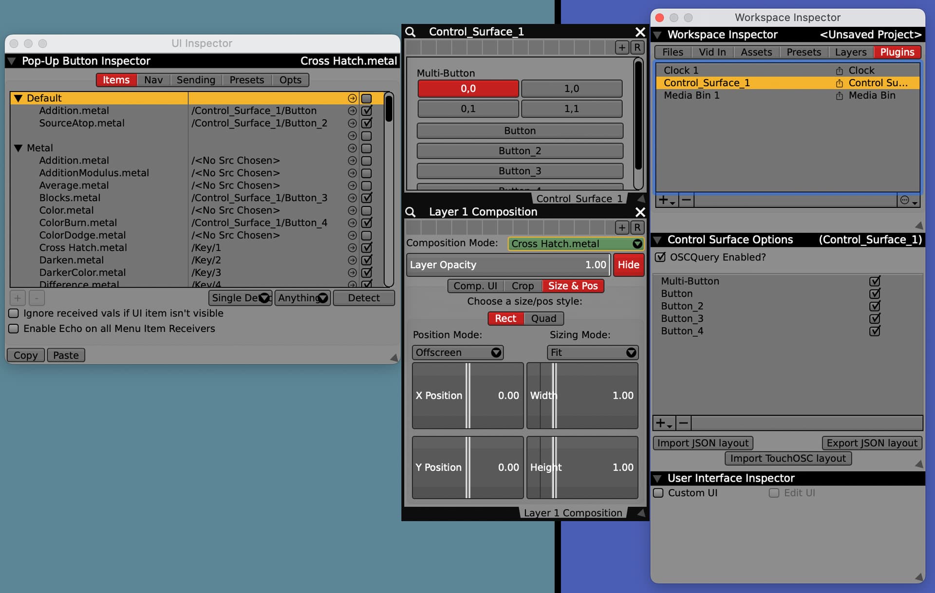 In this project Iâm changing the compositions modes in three ways, 1. With a mult-button, 2, with individual control surface buttons, and 3, with the 1,2,3,4 number keys on my keyboard.