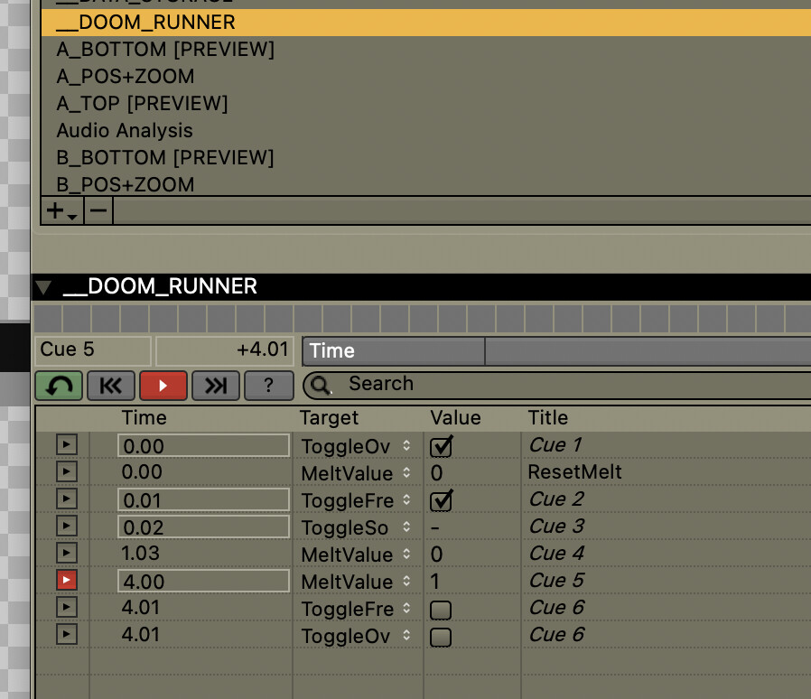 It would also make things like sequencing complex systems a lot easier. For example I have a “DOOM” screen melt transition that cuts between A/B compositions in my rig, but the cue sheet for it is, well, a bit messy, and has a bunch of hacks using custom UIs to “store” data.