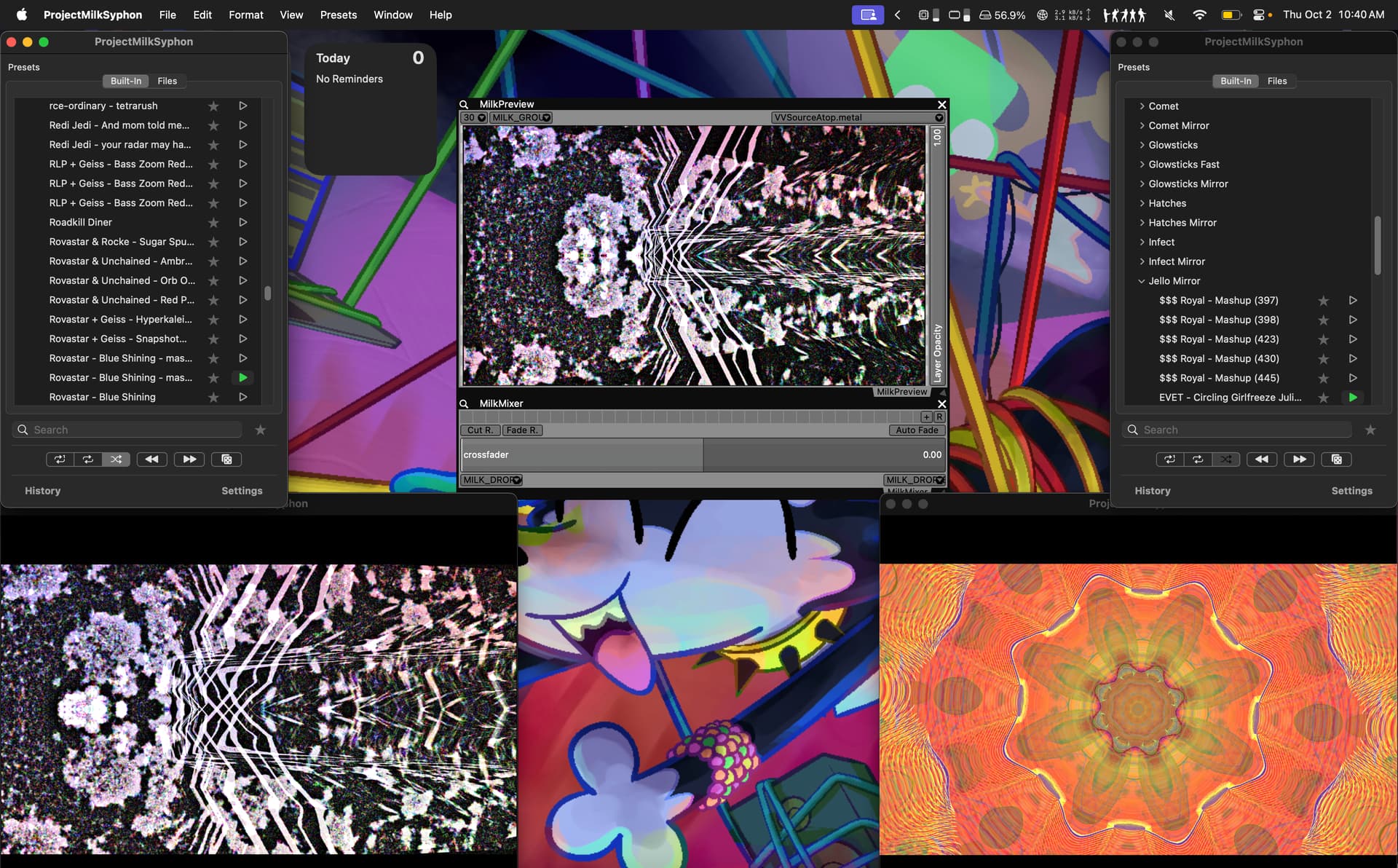 And I run 2 copies of ProjectMilkSyphon so I can test and crossfade during a show. I do a lot of improvisation when performing so this makes it a lot of fun!