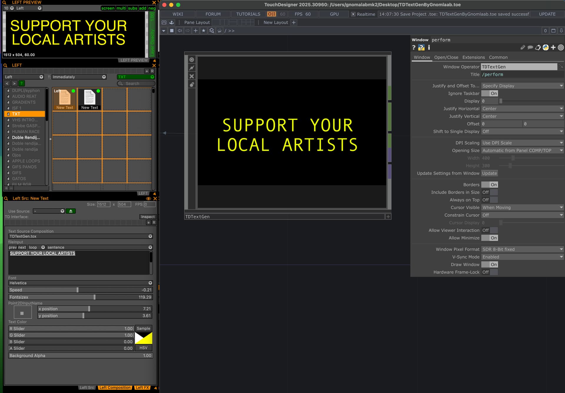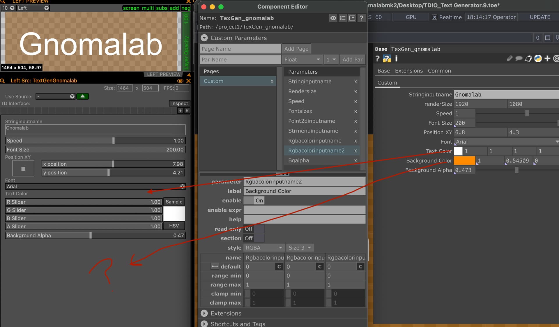 On the other hand, I’m trying to create a basic text patch, change its size, font, position, and text color. So far, so good. The problem arises when trying to create the background color. It doesn’t appear as “public with data” in VDMX. The text color uses the string name Rgbacolorinputname, so I can’t name the background color the same; it should be Rgbacolorinputname2 or something like that, but VDMX doesn’t interpret it. What am I doing wrong?