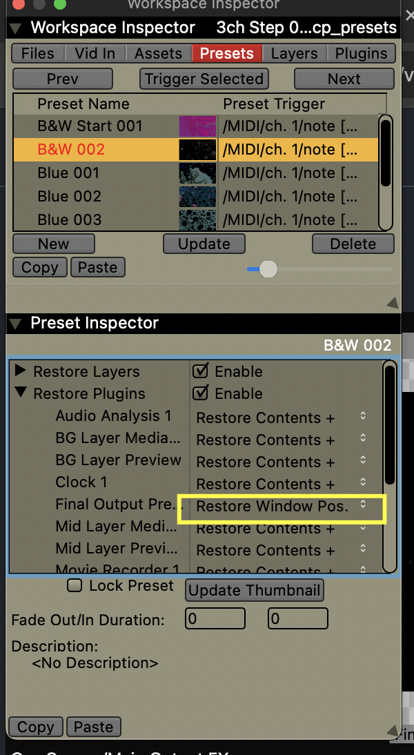 - Here is a triggered preset. After triggering, I have changed the Final Output Preview from ‘Restore Contents +’ to ‘Restore Window Pos.’